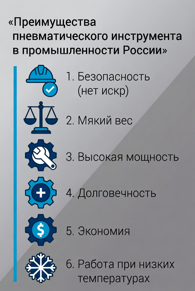 Пневмоинструмент особенно востребован именно в тяжёлой промышленности нашей страны по нескольким причинам:
